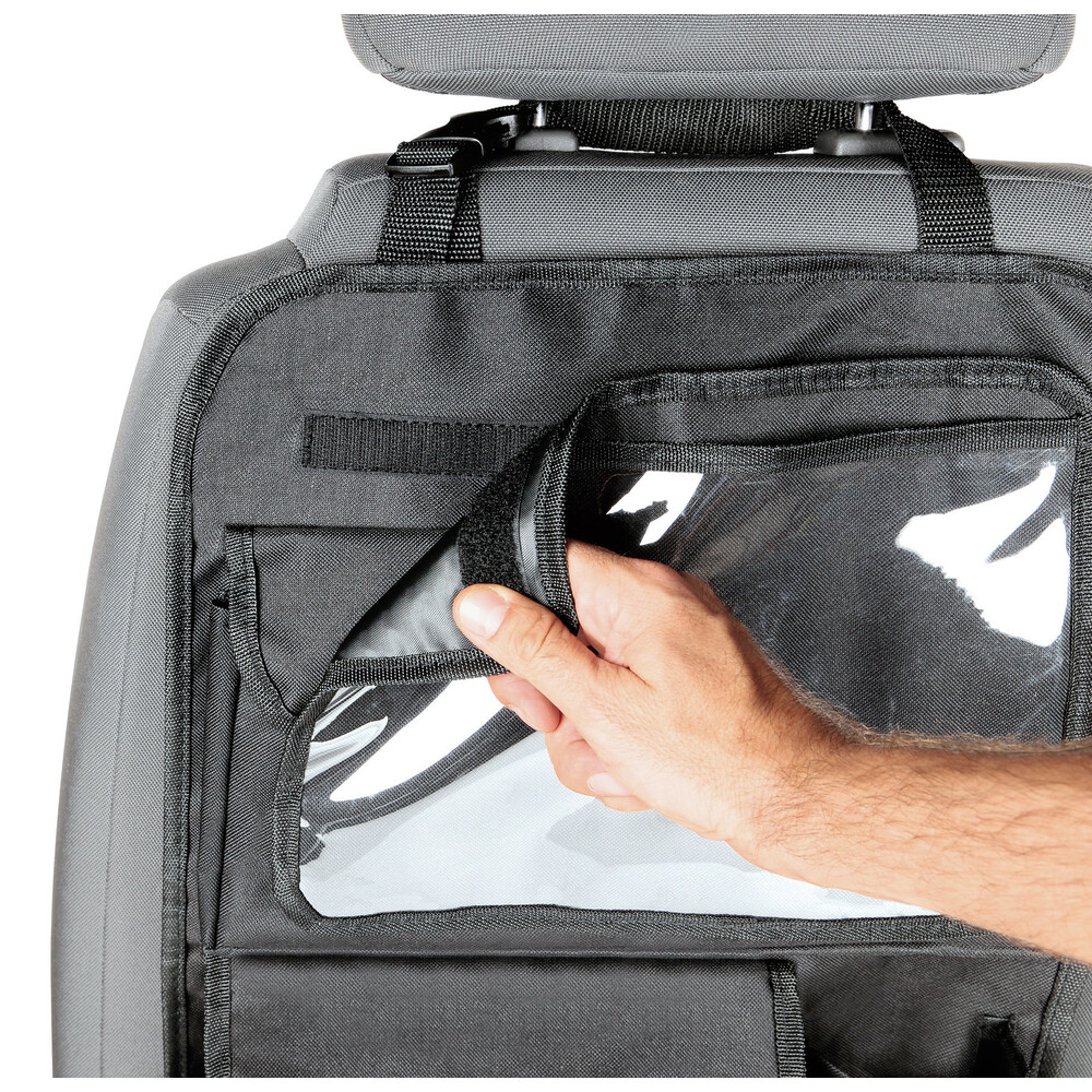 - 2 poches pour ranger tout ce dont vous avez besoin pour le voyage, 1 poche porte-boissons et 1 poche porte-tablet amovible, avec fenêtre transparente adaptée aux fonctions de l’écran tactile.