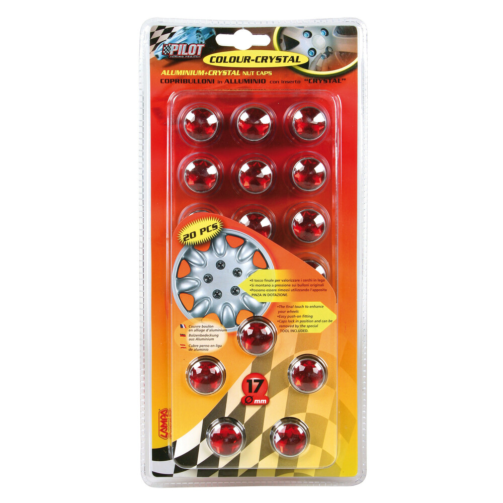 Aluminium avec insertion Crystal. Se montent par pression sur les boulons originaux, faciles à enlever avec la pince fournie.