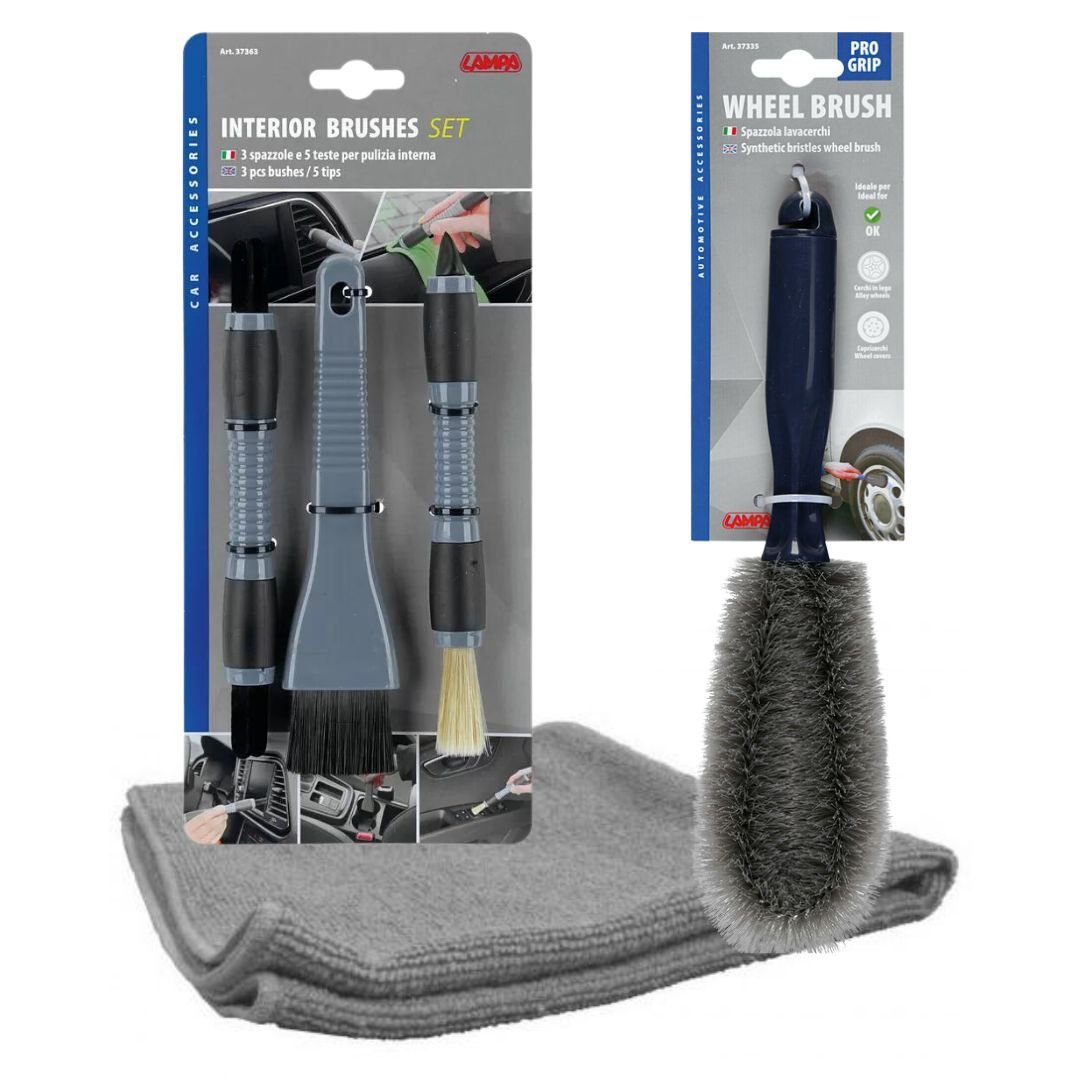 Contient : 1 Brosse jantes + set de 3 Brosses intérieur + microfibre