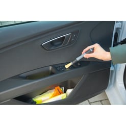 - Brosse double face (3) pour tableau de bord : face A, poils souples en crin pour un nettoyage en douceur et dépoussiérage des coins et interstices ; face B avec caoutchouc à pointe pour accompagner le chiffon et éliminer saleté et poussière des coutures et des zones difficiles d’accès.