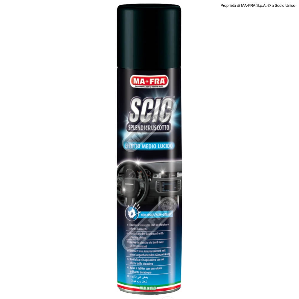 Scic Blue, grâce à sa formule éclaircissante, donne un merveilleux effet brillant moyen au tableau de bord, sans créer d’effet gras et sans provoquer ces reflets gênants sur le pare-brise pendant la conduite.Scic Blue élimine la poussière et redonne brillance et douceur aux pièces traitées. Votre tableau de bord retrouvera son éclat d’origine, sans l’effet « gras » désagréable, mais avec une agréable sensation de propreté et un effet soyeux.