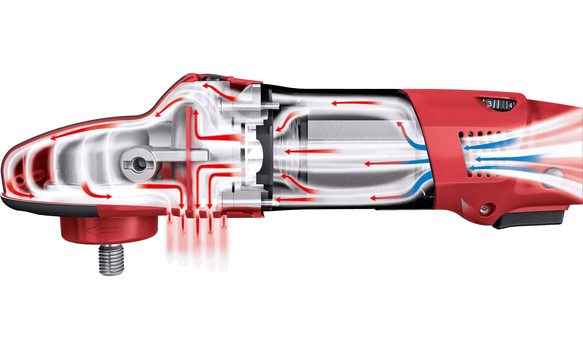 Optimised air flow for optimum cooling of motor and gear. No annoying exhaust air for the user