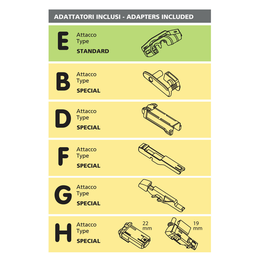 Design à la pointe et aérodynamique. Armature en techno-polymères.Adhérence totale pour un nettoyage efficace.Lame en caoutchouc spécial avec traitement au graphite pour minimiser les frottements lors du contact avec la vitre. Système de montage multiple avec plusieurs raccords fournis pour les essuie-glaces traditionnels et spéciaux pour les essuie-glaces sans articulations