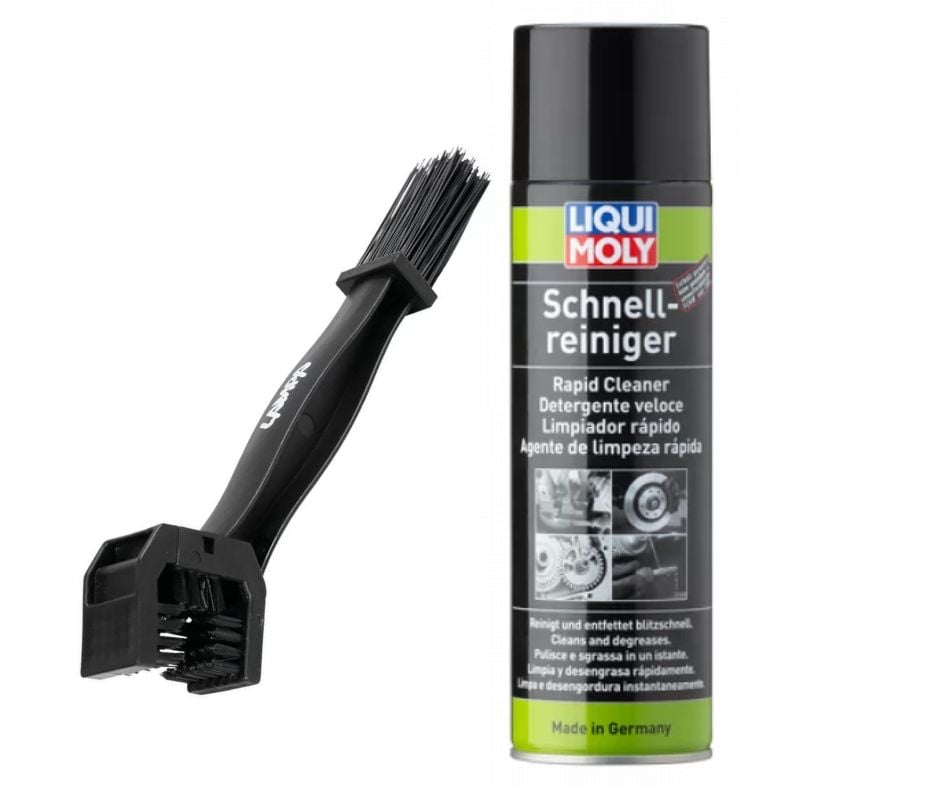 Contient une brosse speciale pour chaine et un Spray Nettoyant universel Liqui Moly